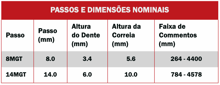 - Disponibilidade padrão em mantas e nas larguras de 20, 30, 40, 50, 65, 85mm (8M) e 20, 40, 55, 85, 115, 170mm (14M).