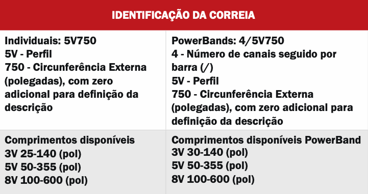 - Topo arqueado, paredes laterais côncavas e cantos arredondados permitem uniformidade da carga de tração e contato uniforme com a parede lateral da polia para excelente performance da correia e desgaste reduzido da polia.
